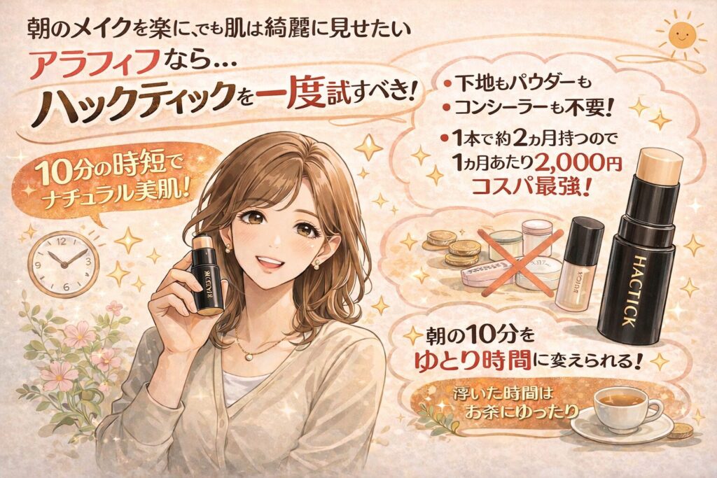 「朝のメイクを楽に、でも肌は綺麗に見せたいアラフィフなら、ハックティックを一度は試すべき!」です。