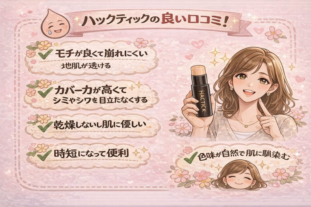 この記事では、ハックティック3回リピ買い愛用者だからこそわかるハックティックの本当の使い心地をベースに、ネットで見かける「カバー力不足」や「毛穴落ち」といったハックティックの悪い口コミの真相についても、私の実感を交えて本音で解説します。