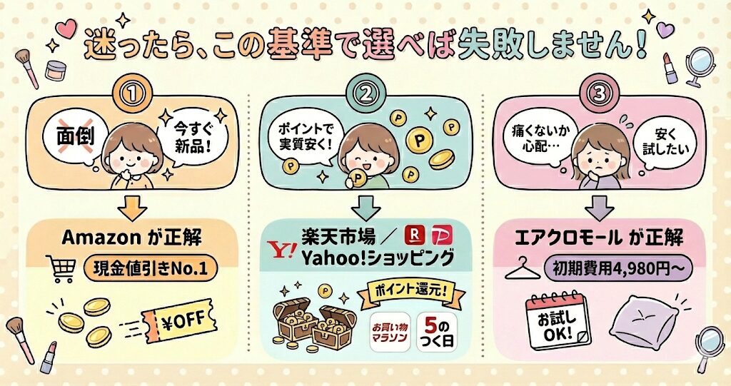 結論からお伝えします。 「安さ」「ポイント」「安心感」、あなたが何を優先するかで選ぶべきショップは変わります。