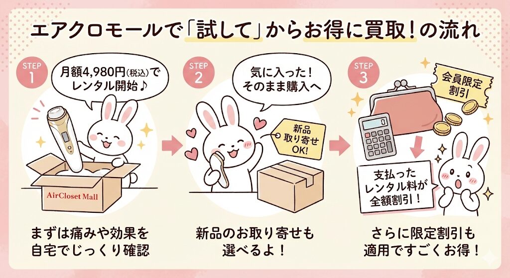 「大きな買い物だから、まずは自分の肌で試したい!」 そんな慎重派の方には、レンタルしてから購入する方法がおすすめです。