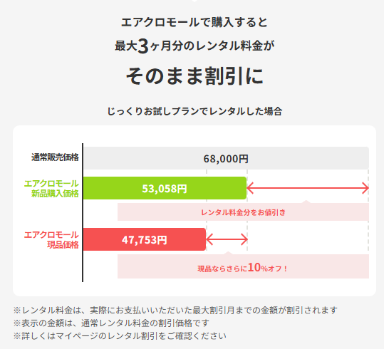 エアクロモールは「レンタル料が購入価格から差し引かれる」という仕組みがあるため、実質的には「試してから買うほうが、むしろ安くなる」