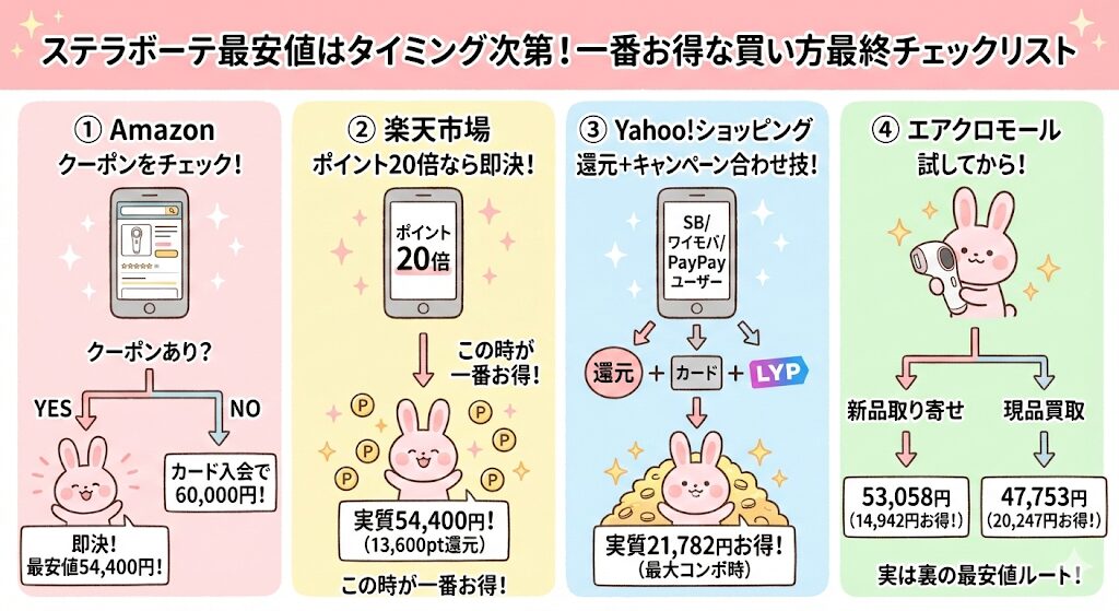 「ステラボーテIPL&LED光美容器」を損せず最安値で手に入れるための最終チェックリストをまとめました。
